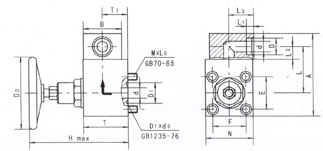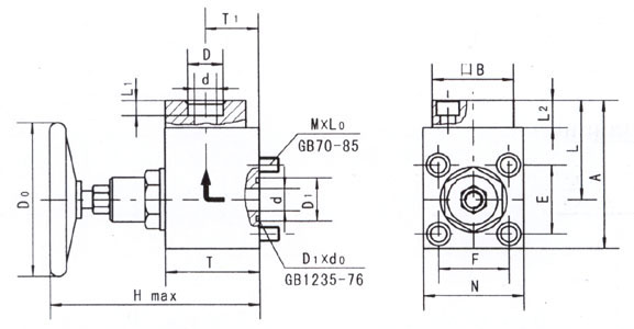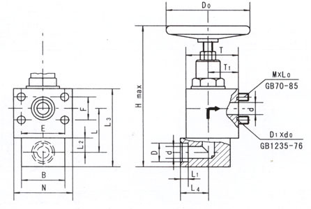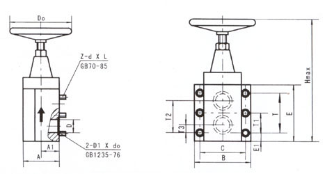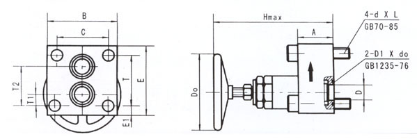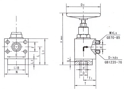 二、型号说明 三、外形尺寸 1、直通内螺纹 2、直角内螺纹 3、直角焊接法兰式截止阀 4、板式焊接法兰式截止阀 5、板式直角焊接法兰式截止阀 6、焊接法兰板式截止阀 7、直角法兰板式截止阀 8、垂直板式截止阀(安装尺寸符合GB8100-87及ISO5781地规定) 9、水平板式截止阀(安装尺寸符合GB8100-87及ISO5781地规定) 10、仿日水平板式截止阀 注:1)板式阀的安装面必须精加工,其表面应达右边示图的要求。 2)对于黑色金属材料的安装面,固定螺钉螺纹旋入深度为1.25D-1.5D(D为螺钉直径),螺钉孔深度应保证螺钉完全拧入。 3)螺钉强度10.9级,需要者另外订货。